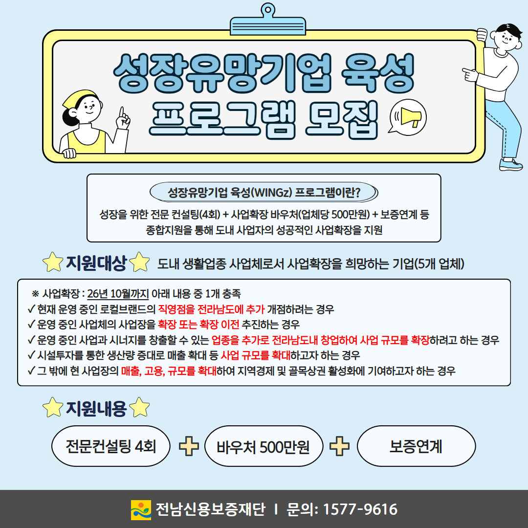 [수정공고] 성장유망기업 육성(WINGz) 프로그램 참여 업체 모집 글쓴이 관리자 조회수 35 날짜 2026-04-27 카테고리 자영업종합지원센터 성장유망기업 육성(WINGz) 프로그램 참여 업체를 모집합니다.모집기한을 5월 11일까지 연장하여 수정공고하오니, 자세한 사항은 첨부된 공고문 확인 후 신청해 주시기 바랍니다. 첨부파일 [수정공고] 2026 성장유망기업 육성(WINGz)프로그램 참여 업체 모집 공고.hwp (176.0K) 다운로드 미리보기 미리보기 파일을 불러오는 중입니다. 로딩이 오래걸리면 미리보기를 다시 눌러주세요. 이전글 2026년 광양시 소상공인 경영혁신 지원사업 참가자 모집 안내 목록 X 비밀번호를 입력하여주세요. 확인